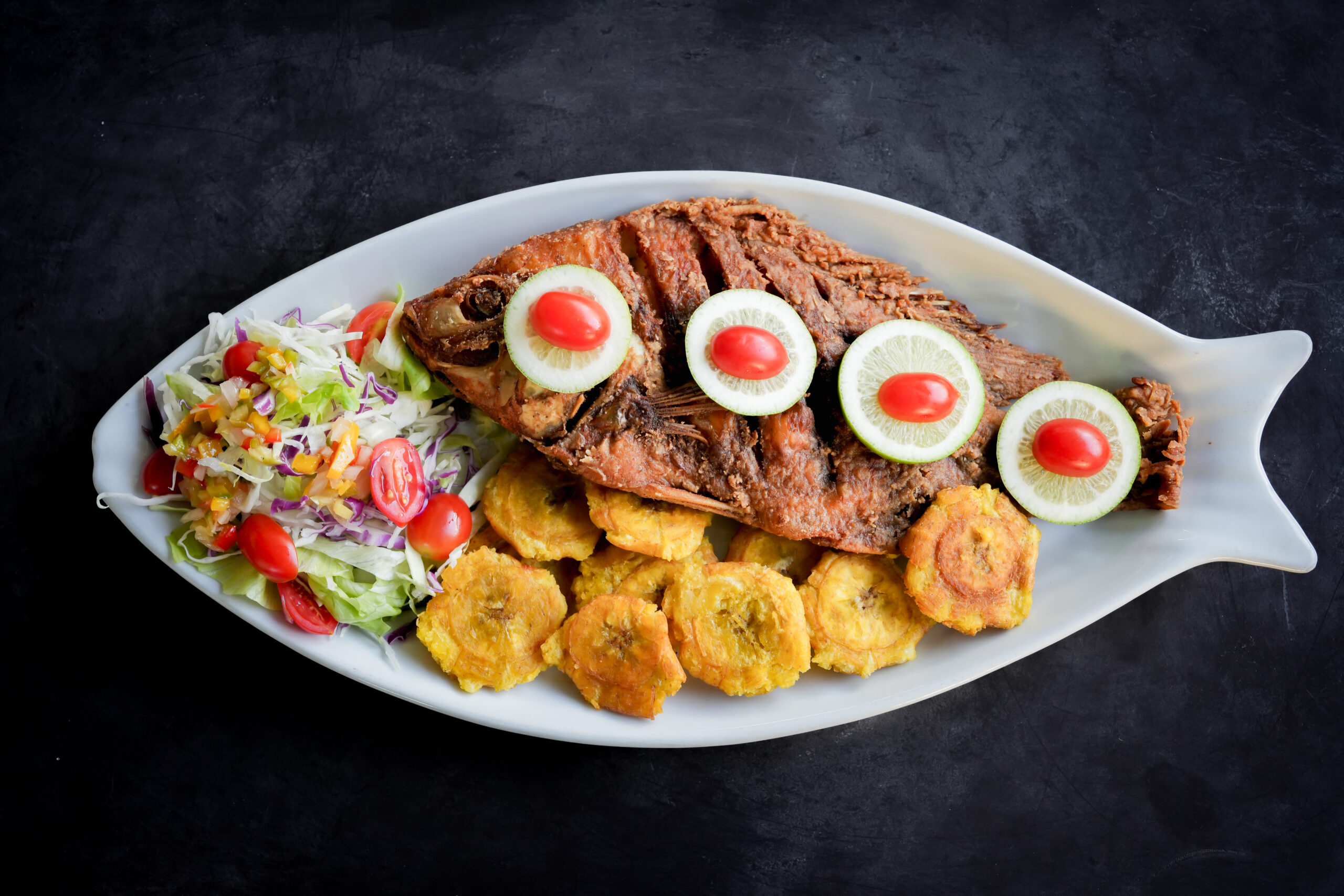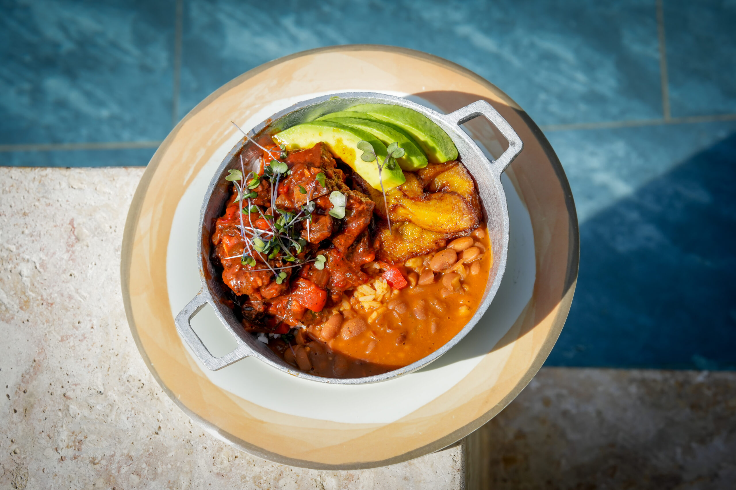 Menú a la carta con opciones tropicales, platos frescos, coctelería y bebidas heladas.